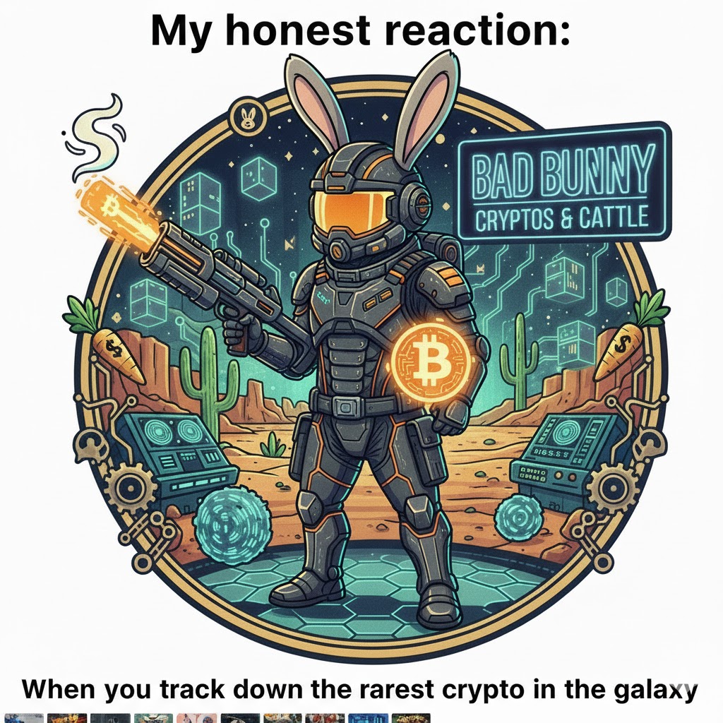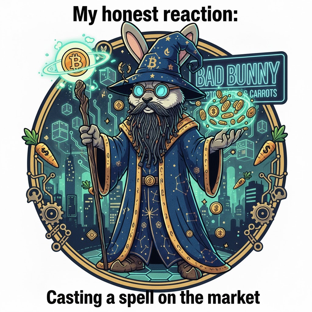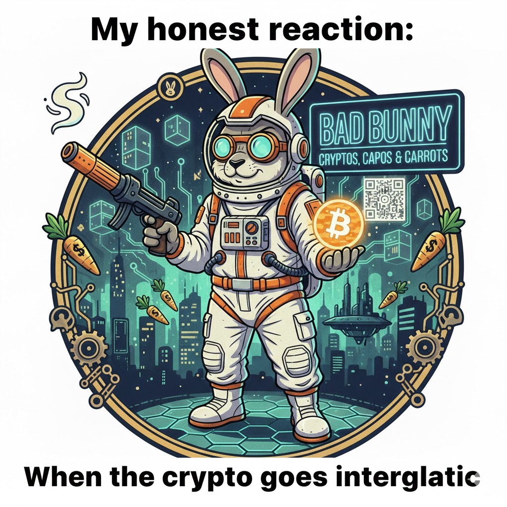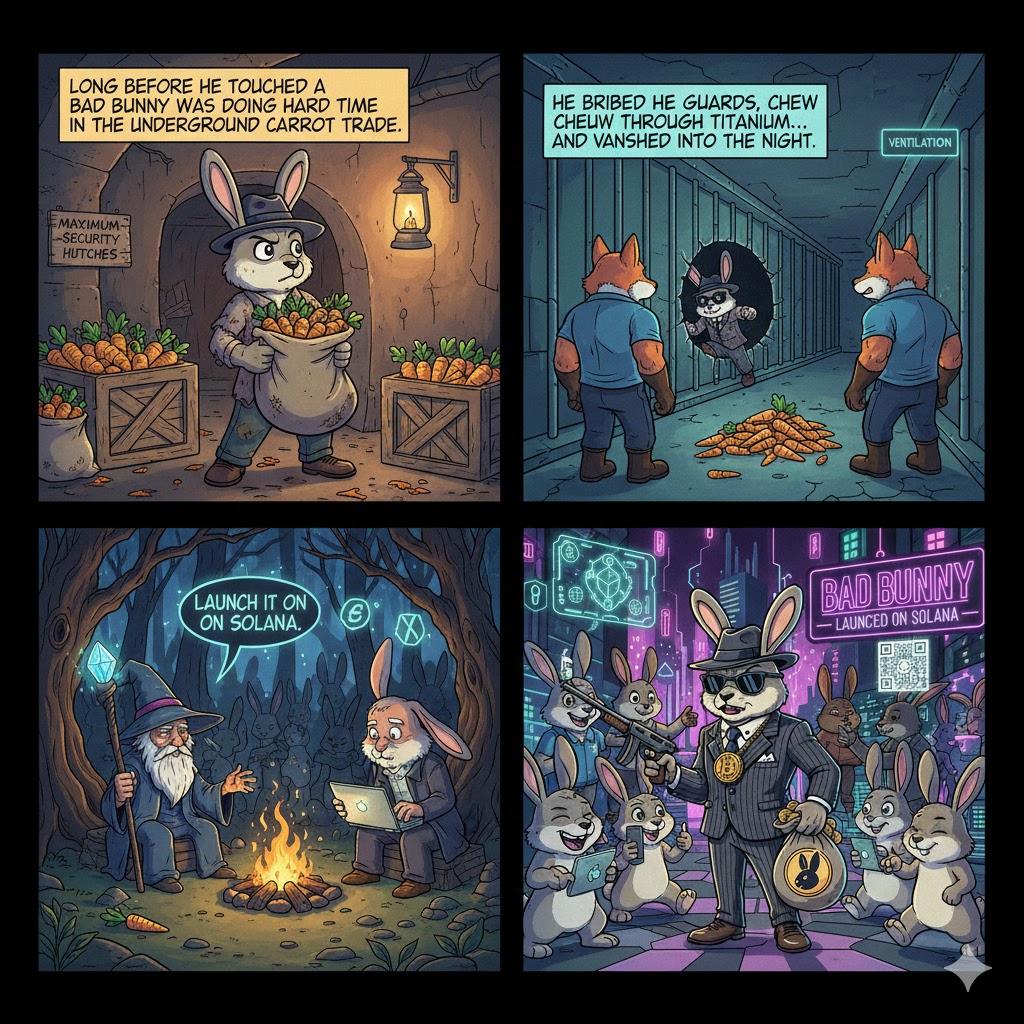 Fast, cheap, and impossible to cage — it was the perfect home for a criminal mastermind rabbit with diamond paws. Bad Bunny traded his tunnels for transactions, his crew for a community, and his prison number for a contract address.